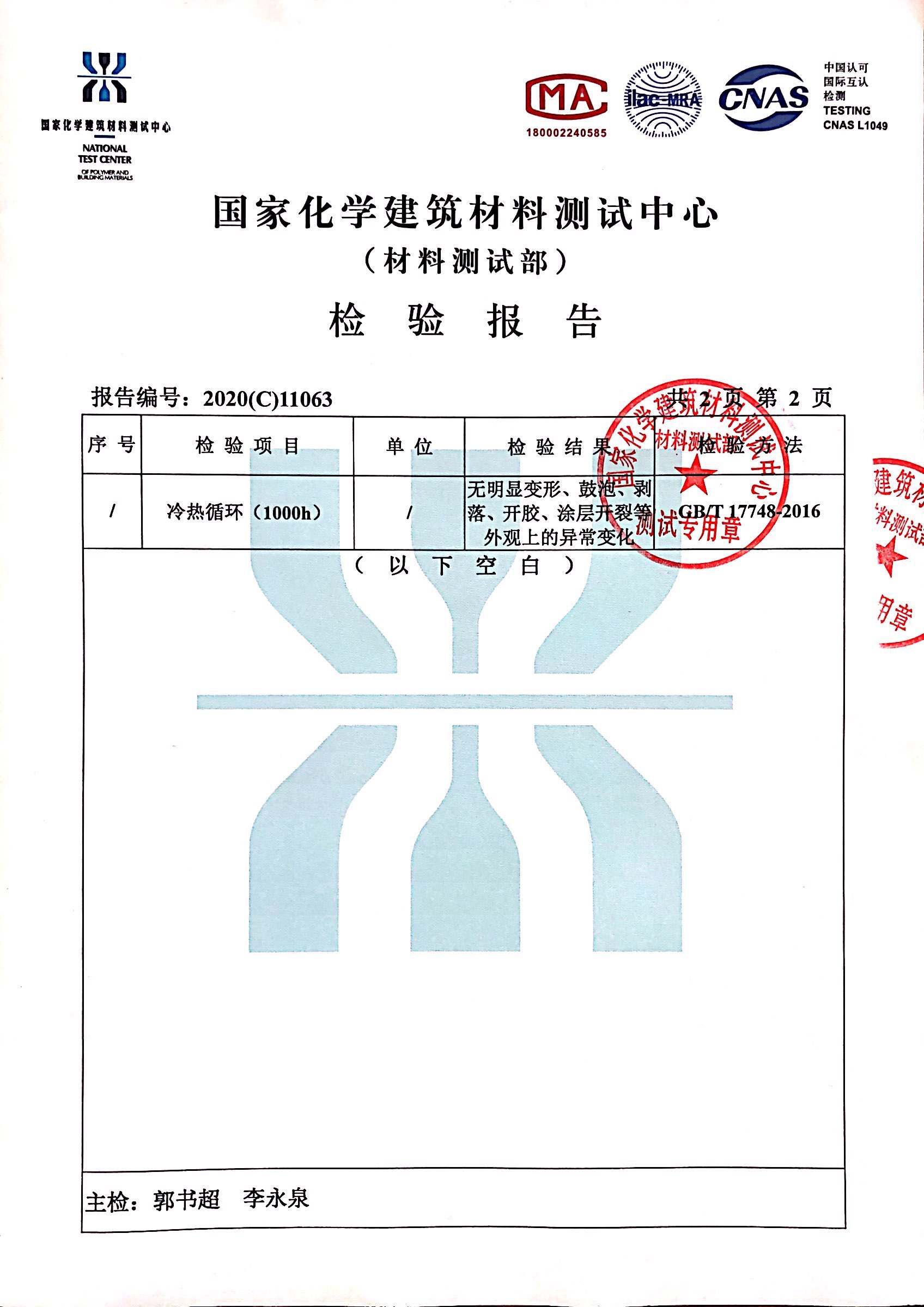 近日,我們收到了來自國家化學建筑材料中心寄來的檢測報告。
